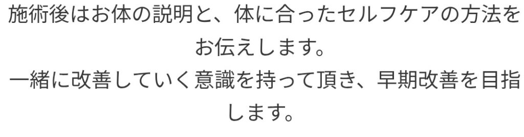 また施術後はご自身でできる簡単なセルフケア方法をお伝えするので、症状の早期改善に繋がります。